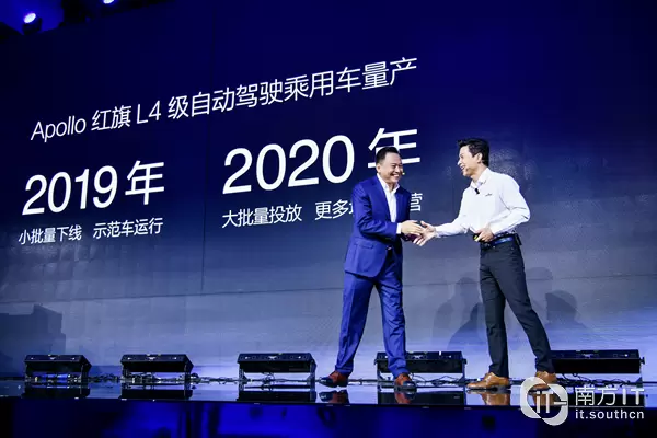 从智能驾驶到智能交通,Apollo展现了其更大的商业化想象空间。继今年7月,百度与金龙客车合作的全球首款L4级自动驾驶小巴“阿波龙”量产下线后,Apollo商业化进程再次加速。会上,百度创始人、董事长兼CEO李彦宏与中国一汽董事长徐留平携手,共同揭晓了国内首个L4级别自动驾驶乘用车的量产计划:2019年小批量下线示范运行、2020年大批量投放更多城市运营。
