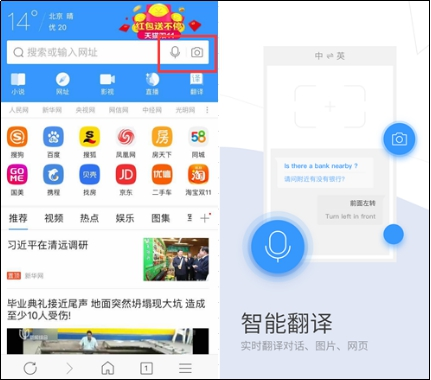 近几年,来中国旅游的外国游客越来越多,在街上遇到外国人问路,直走、左转、右拐这些方向要怎么表达?即便你知道Go straight 、Left、Right,可是再加上十字路口、红绿灯、建筑物,这么复杂的语句想了半天终究被难住了。如果当时手机里安装了搜狗浏览器,如此尴尬的局面就能被打破,按住蓝色键对着手机说,随后搜狗手机浏览器会自动将这句话翻译成英文,点击还能朗读出来,你可以拿给对方听或直接展示文本。待对方看懂后,你可以请他按住红色按钮讲英文,同样会自动翻译成中文。一来一往,翻译的内容以对话的形式一句一句展现在手机屏幕上,绝对不会沟通不清楚、指错路。
