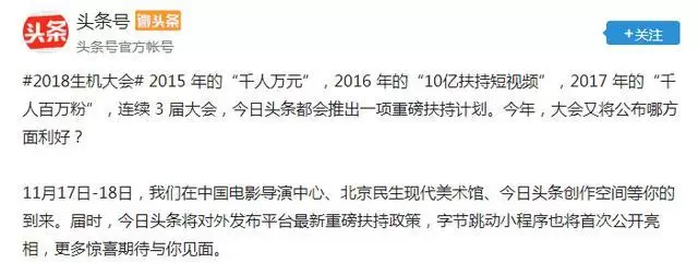回头一看,华为中兴联想还有一家独角兽创企都在开新品发布会,百度腾讯更是在筹备一年N场的合作伙伴大会。新兴巨头头条也不甘示弱,立马发了条消息,表明要开一场跟小程序有很大关系的“2018今日头条生机大会”。