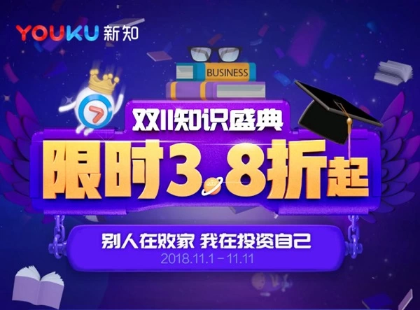 而优酷身为阿里文娱矩阵下的重要一环,怎能错过这个全链路营销的好时机呢?果然,就在这个被“买买买”、“剁手”、“败家”、“双十一预购”等关键词聚焦全民视线的当下,优酷也发挥身为视频网站第一梯队平台赋能的洪荒之力,在11月1号-11月11号期间开启了“优酷新知双11知识付费盛典”。这场以“别人都在败家,我在投资自己”为口号的盛典活动刚一上线,就引发了受众市场的购买狂潮以及业内的一众好评。