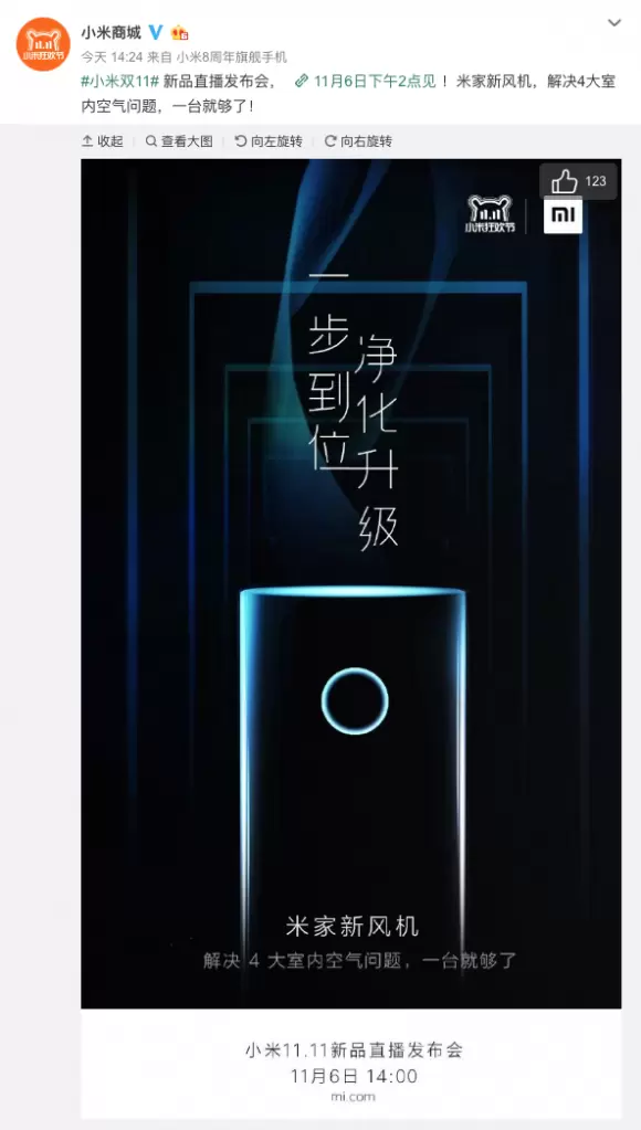 11月2日,小米官方微博发布海报称,将于11月6日11月6日下午2点开启双十一直播,届时将正式发布米家新风机。配文称“解决4大空气问题,一台就够了” 正值小米双十一期间,官方渠道发声力推新品,想必又是一款颠覆行业的性价比之作。