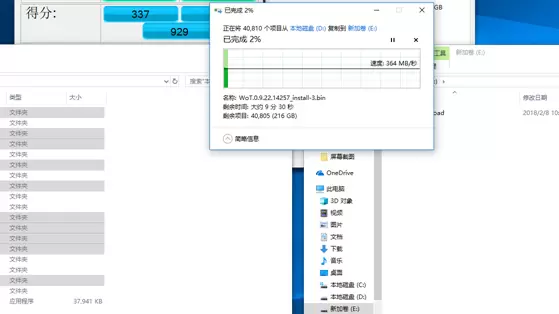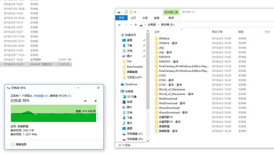 这里我就简单粗暴的从MX300里复制了几个大的文件夹到工程版SSD中去,可见除了由于小文件导致的速度下降以外,平均速度都是在400+以上,表现还是非常可以的。