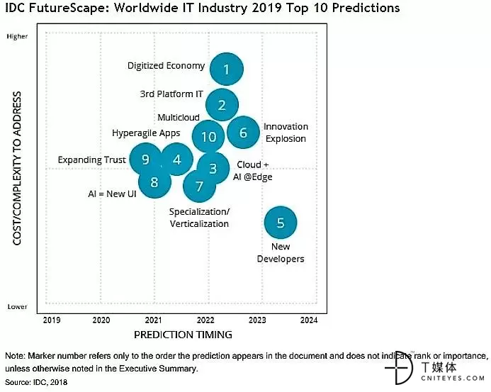 IDC通常根据解决问题的成本/复杂度和预测时间对他们的预测进行排名。而此篇报告中的十个预测主要根据以下两个因素: