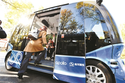 游客可搭乘无人驾驶的“阿波龙”小巴车逛公园