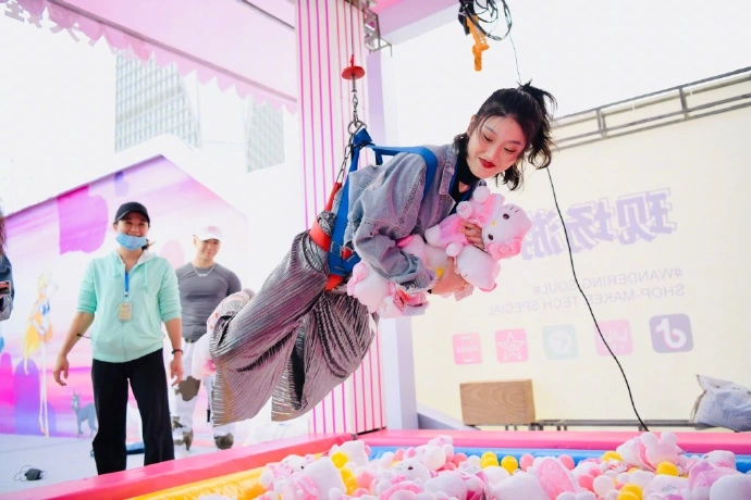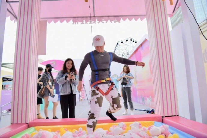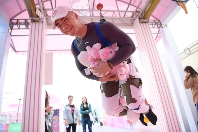 现场,最瞩目的要数Hello Kitty真人夹娃娃机。抓娃娃谁都玩过,不过如果是自己亲自下场到粉红色玩偶海洋里抓娃娃呢?