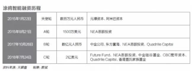 成立于2014年,涂鸦智能共获得四轮融资,总融资额超过2亿美元。最近一次是2018年7月25日,涂鸦获得接近2亿美元的C轮融资,投资者包括澳大利亚主权财富基金FutureFund、恩颐投资(NEA)、中金硅谷基金、宽带资本、QuadrilleCapital、香港查氏家族基金等。截至目前,公司估值已超过100亿元人民币。