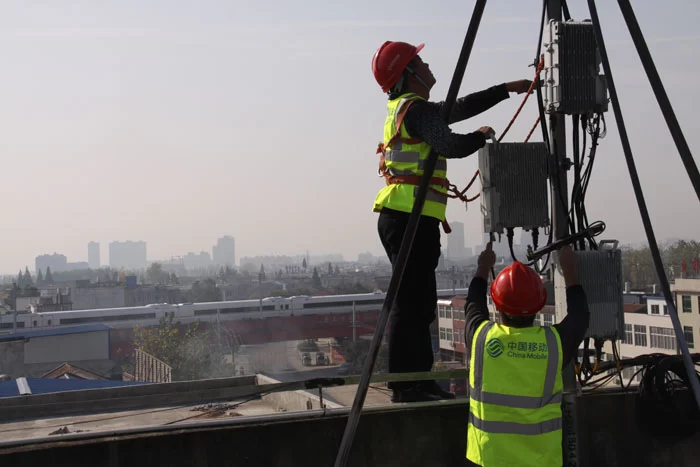 移动技术人员在合武高铁黄冈段调整基站天线,增加网络覆盖效果