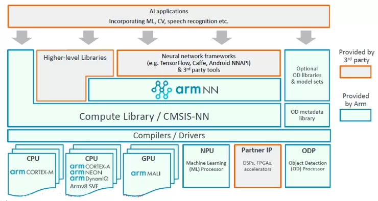 不过,在Dennis Laudick看来软件才是AI处理器中更关键的部分。他表示:“Arm的AI处理器是一个异构的系统,其中包含CPU、GPU、NPU等,但作为IP核想要实现更好的可配置性软件体系非常重要。所以在硬件之上有我们特别优化的Compute Library,它会把底层的硬件和驱动进行充分优化,根据算子的不同需求驱动硬件,可以提升几倍到十几倍的效率。再上一层是Arm nn,可以将TensorFlow、Caffe等神经网络框架转换成Compute Library可以执行的任务,让开发者不用关心底层的硬件,只需要使用标准架构进行开发就可以。”
