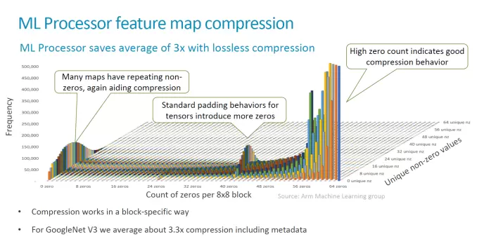他特别指出,Arm在ML处理器的数据管理上做了很多的设计和思考,因为AI的数据搬迁比数据的计算更耗能。他们分析AI处理器中卷积运算所需的能量占不高,但数据的管理和搬迁可能是运算所需功耗的一百倍。因此他们通过分析技术降低功耗,其中一个技术是数据的压缩,可以减少数据的搬迁量,另一个是选择神经网络单元权重激活或者不激活,还有就是数据的过滤,用特殊的方法免除不必要的加工。他们希望通过对不同场景的深入分析,尽量做到数据高效、多次使用,减少数据搬迁降低功耗。