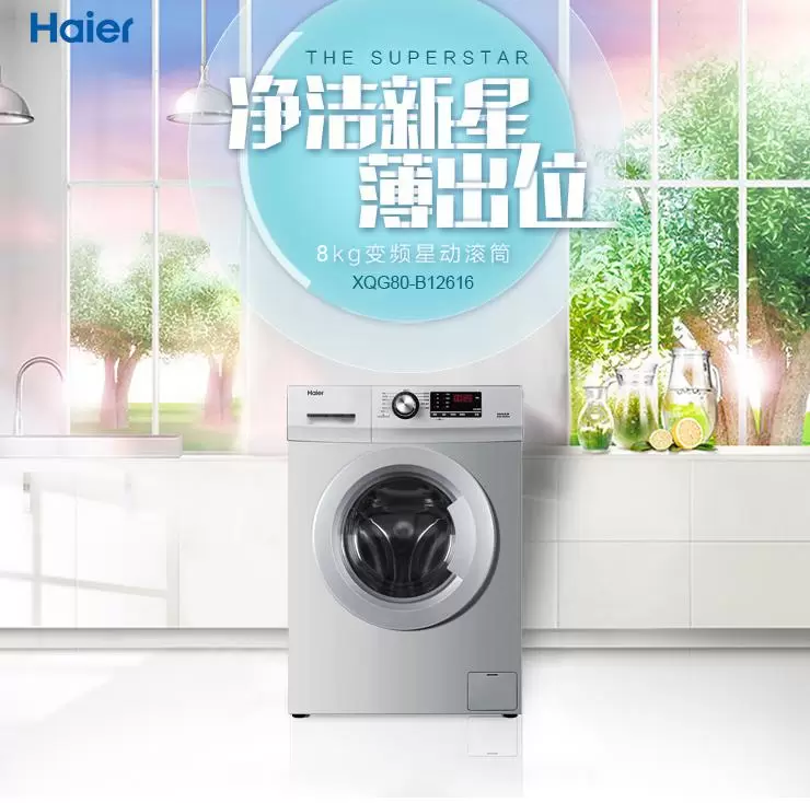 海尔XQG80-B12616 8公斤 滚筒洗衣机,内芯强劲卓尔不凡,BLDC变频电机,1200转高转速,无碳刷设计,静音无声,澎湃动力也能静静洗;310米/分高速冲刷,运用高温高速水流冲刷内筒外壁,去除污垢防止衣物二次污染;大内筒,摔打路径更长,提升洗净比,空间大防止衣物堆积产生褶皱。海尔内筒双面冲孔工艺,不易损伤织物纤维,温柔呵护衣物。全家衣物大管家,一机帮你解决各种衣服清洗问题。