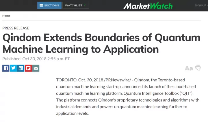 根据美国道琼斯公司旗下市场观察网站(MarketWatch.com)消息,来自多伦多的华人量子机器学习创业团队Qindom发布其QIT(Quantum Intelligence Toolbox)量子智能云平台。该平台将通过Qindom自主研发的量子机器学习(Quantum Machine Learning, 简称QML)技术及算法,对接AI应用场景,驱动量子智能(Quantum Intelligence,简称QI)在行业应用层的创新。