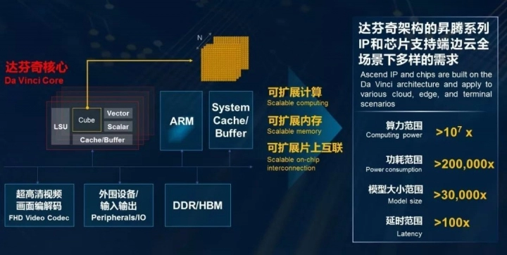昇腾系列AI芯片的另外一个独特优势是采用了华为开创性的统一、可扩展的架构,我们内部命名为“达芬奇架构”。