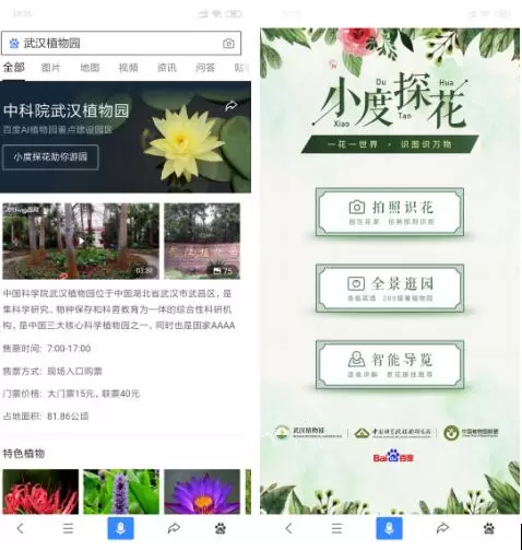 据陈凯介绍,百度“AI植物园”主要围绕“植物研究”、“公共科普”和“园区管理”三个方向建设,充分利用百度数字内容、百度AR建模平台、多模态交互技术、知识图谱,以及人脸识别、智能客服系统、大数据智能平台等技术,为用户游览植物园提供游览前、游览中、游览后的全方位服务。以游览中为例,用户在武汉植物园等合作植物园中,均可以使用已落地的“小度探花”产品,实现拍照识花、全景科普、智能导览等应用,获得更好的游览体验。借助于百度领先的图像识别技术,目前“小度探花”提供的拍照识花功能对于花卉的识别准确率达到了92%,对于一万种常见植物的识别准确率达到了88%,让你真正可以实现遇到不认识的植物“一拍便知”。
