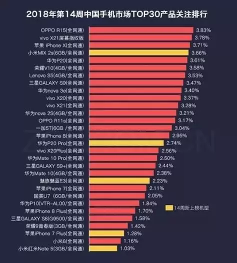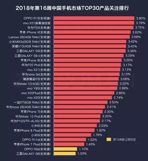 4月23日,在中关村在线公布的2018年第16周关注度排行榜,OPPO R15获得3.80%的关注度顺利登上冠军宝座,从数据上看OPPO R15成为中国手机市场最受关注的手机。