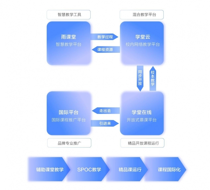 智慧教学生态解决方案将网络课堂与实体课堂的用户、数据、场景全方位打通,是新时代教育教学的伟大变革。方案包括课堂智慧教学平台“雨课堂”、校内网络教学平台“学堂云”、在线课程运行平台“学堂在线”以及课程国际化推广平台,可以为高校提供从辅助课堂教学,到SPOC教学,到国家精品在线开放课程运行,再到课程和学位国际化的全方位、全流程服务。各级高校还可以把国内外优质课程资源无缝对接到校内SPOC和课堂教学,提升教学质量。构建一个连接校内校外,融合线上线下,贯穿课内课外的新型教学生态。