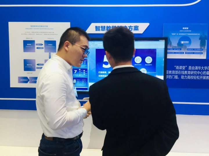 学堂在线工作人员向参观者介绍并演示雨课堂