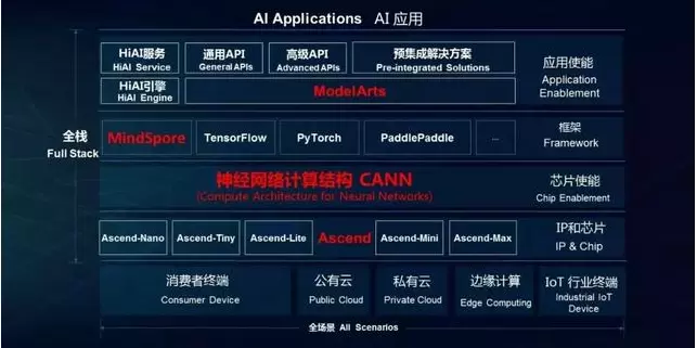 2018年10月10日,华为正式发布全栈全场景 AI 解决方案。全栈,意味着为广大 AI 应用开发者提供强大、经济的算力,低门槛的应用开发平台,实现 AI 数据建模、模型训练、应用开发更加简单、敏捷、高效。全场景,意味着让智能无所不及,覆盖端、边、云任何商业场景。