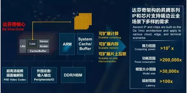 昇腾系列 AI 芯片的另外一个独特优势是采用了华为开创性的统一、可扩展的架构,即“达芬奇架构”,它实现了从极致的低功耗到极致的大算力场景的全覆盖,市场上还没有其它架构能做到。“达芬奇架构”能一次开发适用于所有场景的部署、迁移和协同,大大提升了软件开发的效率,加速AI在各行业的切实应用。