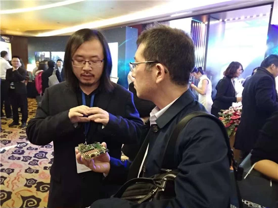 润和软件的AI专家(左)在向到场客户介绍智能芯片