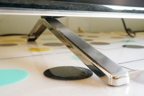 接下来我们看正面,真正的三面无边,除了下方以外,另外三个边几乎看不到边框,这是因为65H9S采用了无边贴合工艺,黑屏的时候不算很明显,但当屏幕点亮时,瞬间让你身临其境。此外,采用了Unibody一体成型翻边工艺,打破传统贴合,一次性无缝折弯成型,左、中、右三个中框与背板融为一体,在边角处也看不到其他彩电那种不甚美观的接缝,搭配上马海丽吊桥金属底座,整体看上去真真是科技感十足。