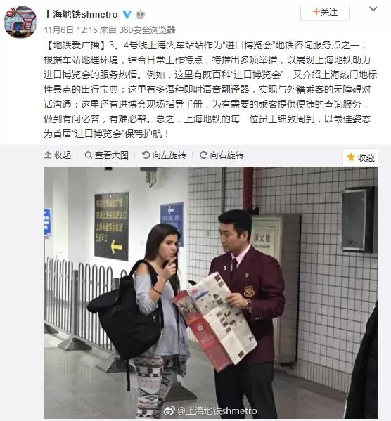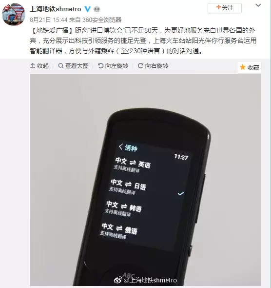 而这样的服务升级保障了进博会的完美召开。一个真实发生的事情很好的体现了这一点。 5 名进博会外国参展商换乘地铁时迷了路,只会说西班牙语的他们既问不了路,也看不懂中文。还好工作人员拿出了站点上特地为此次进博会而添置的多国翻译器讯飞翻译机2.0,为他们解决了路线的问题,也很好的进行了交流。
