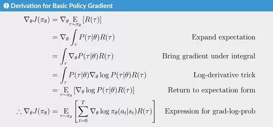 最后在强化学习简介部分,OpenAI 还重点介绍了策略优化,这一部分有挺多推导的,尤其是梯度的推导。不过好消息是这些推导都给出了详细的过程,包括变换、消元和一些对数技巧等。读者可以感受下推导过程: