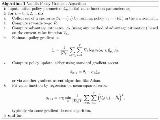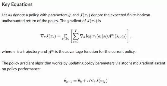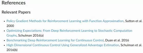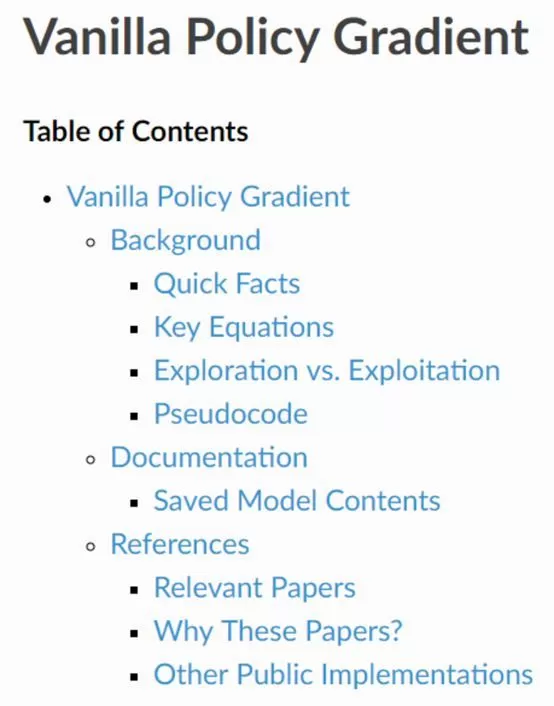 比如策略梯度算法,如上图所示,文档中会给出关键的方程、伪代码、使用方法以及参考文献。