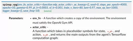 策略梯度算法的调用函数,我们可以看到,Spinning Up 提供的函数调用可以直接设置参数。文档还提供了详细的参数解释。