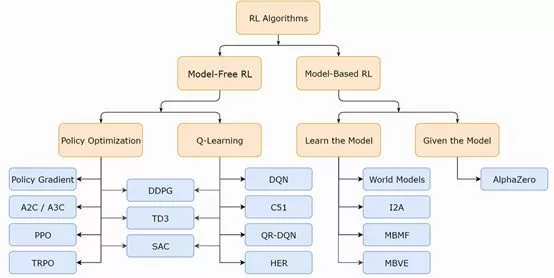在关键概念之后,OpenAI 详细介绍了各种强化学习算法及技术在整体所处的位置。如下所示,强化学习也是个桃李满天下的大家族: