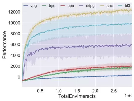 Spinning Up 提供了 MuJoCo Gym 任务套件的 5 个环境下的算法实现基准,包括 HalfCheetah、Hopper、Walker2d、Swimmer、Ant。