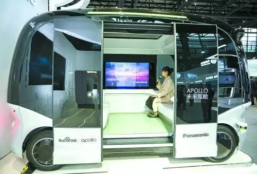无人驾驶小巴“阿波龙”,“边坐车边唱K”的体验吸引了不少观众 新华社/图