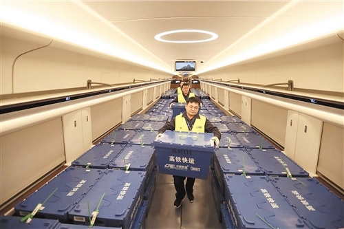 工作人员正在往“高铁货运专用车厢”内搬运货物