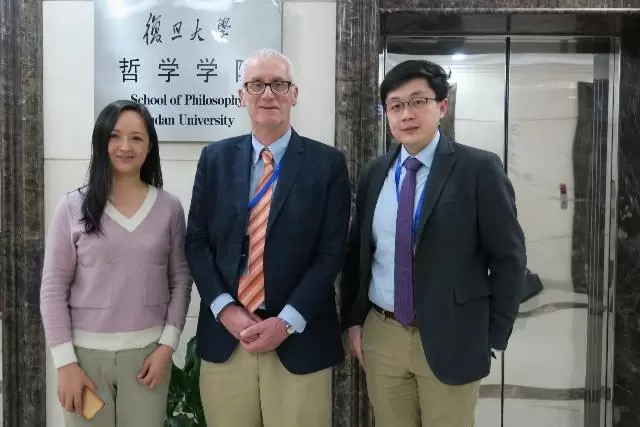 记者李念采访后与PRICE 教授,刘洋博士在复旦哲学学院合影