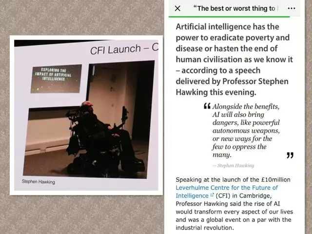 霍金出席CFI成立仪式并做主旨演讲(左图),右图为当日网页报道截图