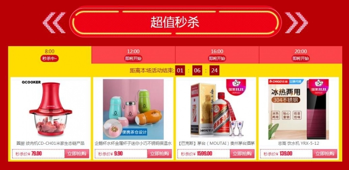 如果你11.11当天没有抢到超值秒杀好货,不要失望,返场超值秒杀再给你一次机会。12日-13日,每天8点、12点、16点、20点整点秒杀超低价抢好货。