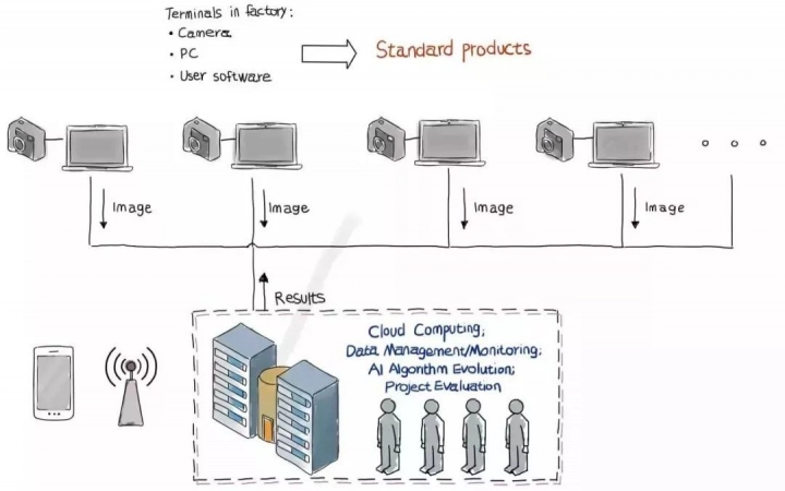 美的工业视觉检测云平台采用了这样的架构:前端图像收集-云端大数据分析-深度学习模式识别,解决视觉检测环境的非标难题。前端设备收集的图像数据通过4G 或Wi-Fi 传输到云端,通过深度学习框架,经由训练获得非标准化视觉检测特征,最终打造出通用化、智能化的瑕疵检测能力。