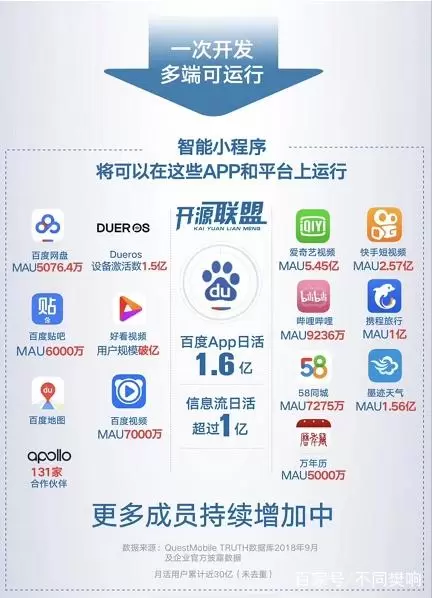 在百度世界大会上,百度宣布其百度小程序月活数突破1.5亿,服务涉及政策民生、娱乐、资讯等23个大行业,覆盖了262个细分领域。另外,百度宣布智能小程序开源联盟正式成立,首批联盟成员包括爱奇艺、bilibili、快手、墨迹天气、携程、万年历、58同城等十多个App和平台,这些App和平台月活不去重累计数超过30亿。