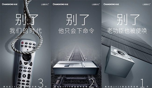 一张遥控器上吊的照片配以“别了,我们的时代”,不难让人联想到早前暴风电视提出的“扔掉遥控器”口号。而从11月11日开始,长虹电视官方微博就不断更新预热海报,从上吊的遥控器,到卧轨的电冰箱,再到今日跳楼的洗衣机,长虹电视本次的新品玩的可比暴风大的多。