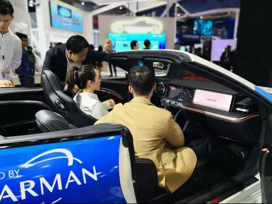 车载互联展区,三星将强大的车辆数码驾驶装置—智能驾驶舱装配到一辆蓝白相间的豪华跑车上,格外抢眼。参观者进一步了解发现,该车辆的驾驶座及副驾驶座相连的全部区域里,包括仪表盘、音频等装置已改变成一个智能平台,该平台将物联网所能连接到的事物,进一步连接到了汽车驾驶舱。坐在车上,用户可用车载Bixby远程调控家居设备,用28英寸显示屏观看高清视频,用智能仪表盘查看天气、实时路况、播放音乐。“用车内的屏幕就能控制一切。开车在回家路上的时候,通过屏幕的智能语音识别助手就可提前将家里的空调打开,还能提前看到家中冰箱有什么、缺什么,通过显示屏和闪送服务相连的接口,直接下单购买所需食品,这也太酷啦!”很多参观者被三星创造的未来车载生活所折服,纷纷拿出手机、相机合影留念。