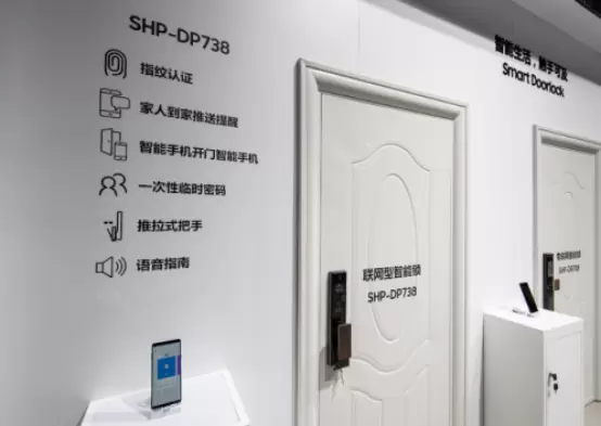 在系统解决方案展区,参观者除了参观了解三星智能建筑、健康物联网相关的系统解决方案外,还能真切体验到三星今年6月底引进中国市场的最新互联网智能门锁。该产品的亮点是,在智能手机下载APP后,WiFi状态下连接锁,可实现远程控制,并实时记录试图盗锁等情形在内的所有出入情况。很多参观者现场拿起手机进行了体验,并兴奋地表示:“如果在上班、或者在外出差、旅游,家人想进门没带钥匙,就能在手机端帮他开门了”。同时,其“碰触式”开门功能也非常强大,很多参观者也在现场进行了体验。该智能门锁有两个感应器,当屋主人离门口50—70厘米时,其中一个感应器会感应到,继续走近,在锁把手轻轻一搭,锁会瞬时打开。另外一个感应器有测温功能,如果室内温度超过70℃,锁会发出警示音,并自动打开。在这一展区,参观者真实体验到了三星产品的智能化和安全性。