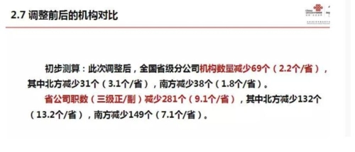 省公司职数(三级正/副)减少281个(9.1个/省),其中北方减少132个(13.2个/省),南方减少149个(7.1个/省)。