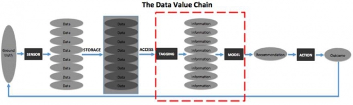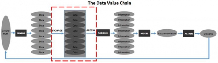 下面的数据价值链流程图显示了大多数AI创企获取和使用数据的方式。首先,企业将基础事实的片段作为原始数据进行记录。企业可将原始数据存储在某处,然后建立流程或途径进行维护和访问。在运用于AI模型之前,企业需要对数据进行标注,以便AI模型实施处理每个数据点的行为。随后,训练有素的模型接收数据并产生反馈,企业便可以使用这种反馈来执行驱动终端用户某种行为的操作。该过程可以分为三个不同的步骤:获取数据、存储数据和为了训练模型而标注数据。每一步都会产生相应的成本。