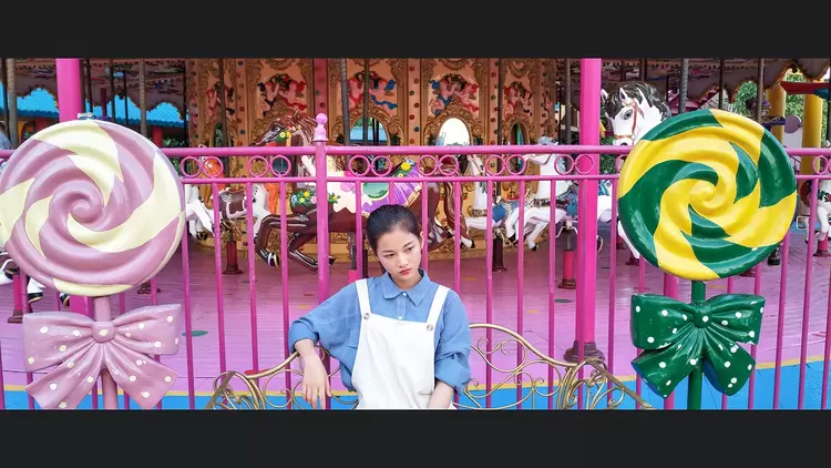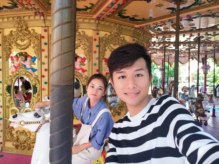 因为旋转木马在行进间是禁止在里面走动的,所以拍照时只能坐在木马上跟拍,但这样取景角度的变化会比较少,而且随着旋转木马的360度旋转,光线条件的变化会非常大,同时身体也在跟随着晃动,这样的场景就相当考验手机的拍摄功力了!