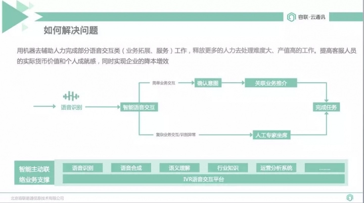 分享中李文超指出:“人工智能在真正落地的时候,实际上并没有那么智能。现在的人工智能只有在逻辑计算、语音识别、还有图像处理等方面有一些明显的进步,但在通用的人工智能里面还没有较大的突破。比如客服领域智能化一定是人机结合的方式,而不是机器去取代人。机器和人各有优势,机器可以365天无眠不休不知疲惫,也可以处理大量简单而重复的工作。而人可以去解决很多更复杂的问题。在客服领域,机器人先去处理客户提出的问题,当机器人处理不了的时候,再去转给人工解答,同时系统还可以推荐一些话术帮助客服减少人工去知识库搜索和记忆的过程,提高座席工作效率。”