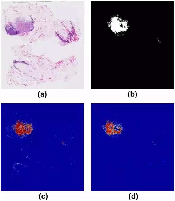 如上图所示:(a) 原始病理切片; (b) 病理医生标注,其中白色部分为肿瘤区域; (c) 以前算法预测的肿瘤区域; (d) 百度研究院“神经条件随机场”算法预测的肿瘤区域