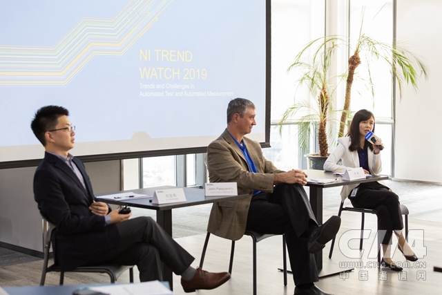 图:NI大中华区市场经理刘旭阳(左)、NI市场营销副总裁John Pasquarette(中)和NI亚太地区市场总监汤敏(右)接受采访