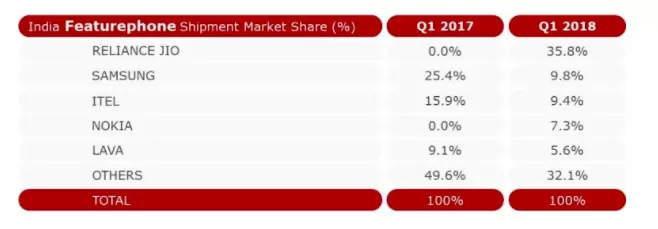 Counterpoint 同时公布了功能手机市场排名,JioPhone以36%的份额排在第一位;三星份额为9.8%,排在第二位;中国传音的Itel品牌位居第三,份额为9.4%;诺基亚位居第四,份额为7.3%;印度手机公司Lava排在第五,份额为5.6%。