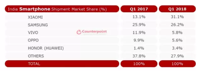 Q1小米印度智能机份额创纪录达31.1%,OV荣耀进前五