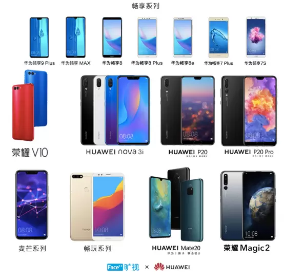 自2017年旷视涉足移动设备领域的AI创新应用以来,便与华为建立了紧密的合作关系,从最早的荣耀V10到荣耀Play,再到麦芒全系、畅享和畅玩全系产品,以及Mate20、P20和Magic系列等人气机型,旷视科技提供的人脸识别解锁及支付技术几乎覆盖了华为全线智能手机。