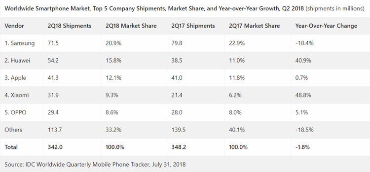 另外值得一提的是,根据IDC二季度统计报告显示,苹果在智能手机上的销量已经落后于中国品牌华为,其在2018年第二季度全球智能手机市场整体下滑1.8%,并且相比去年同期进一步降低,目前排在第三。而小米和OPPO则分别占据第四和第五位,进一步突显了中国智能手机品牌已经持续给国外品牌带来巨大的压力。